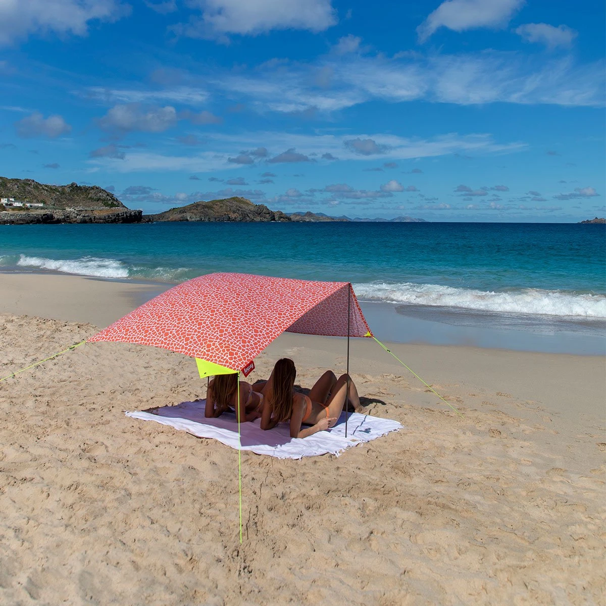 De opvouwbare Miasun strandtent weegt iets meer dan een kilo en past er in elke tas of koffer nog wel bij. Op te zetten in 90 seconden met katoenen doek (in verschillende kleuren en patronen) en uitklapbare aluminium stokken. Deze slimme strandtent mét UV filter is groot genoeg om met twee volwassenen en twee kinderen onder te zitten of liggen.