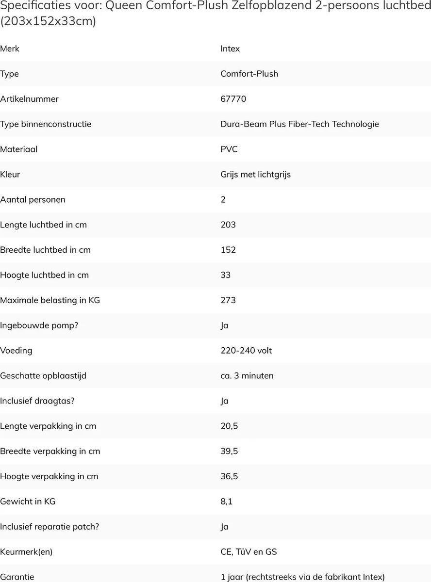 Intex Comfort-plush Full Luchtbed – 2-persoons – 203x152x33 Cm