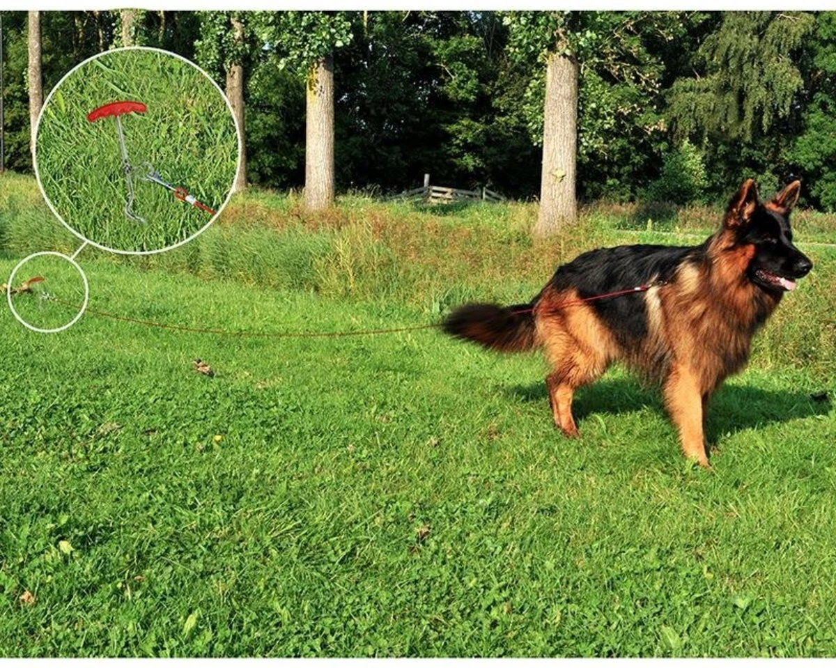 Een aanlegspiraal! stel, je gaat een dagje naar het strand, lekker picknicken of nog beter, je gaat op vakantie en je neemt de hond mee. Dan is een aanlegspiraal een handig hulpmiddel wat voorkomt dat je viervoeter ‘de benen neemt’. Een aanlegspiraal is een stevige metalen pin in de vorm van een kurkentrekker die in de grond wordt geschroefd. Aan de spiraal zit een oog waaraan je een lijn kunt bevestigen. Een wartel voorkomt dat de lijn in de knoop raakt. Gebruik bij voorkeur een zachte lijn met een stevige sluiting. Een lengte van vijf meter is meer dan voldoende. Gebruik een aanlegspiraal liever niet in combinatie met een gewone halsband. Een goed passend harnas zit een stuk prettiger.