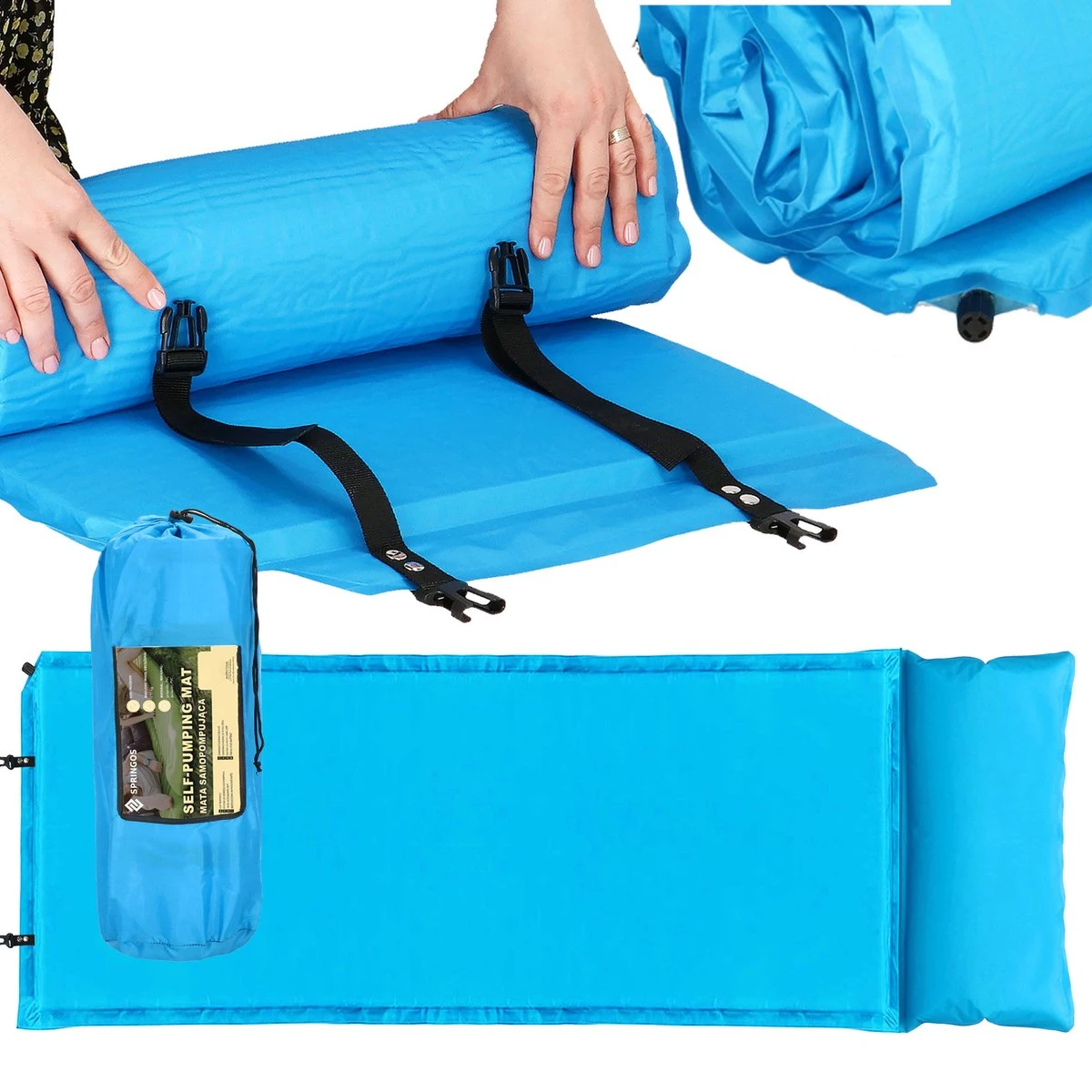 Springos Slaapmat | Zelfopblazend | 186 Cm | Inclusief Hoes & Hoofdkussen | Lichtblauw